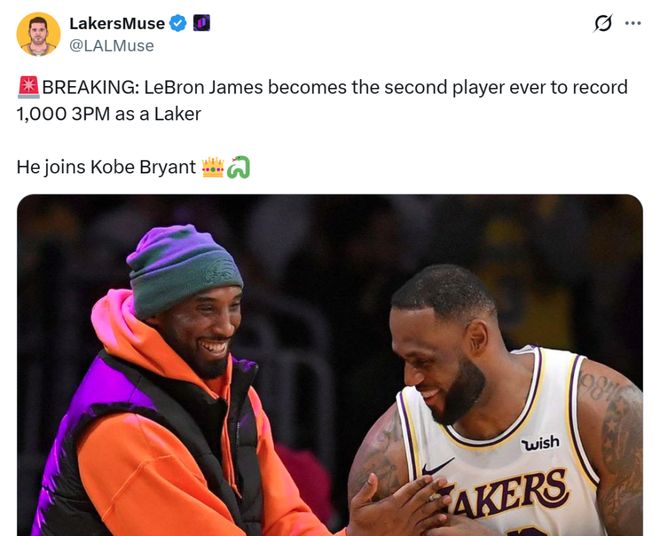 憑借這樣的表現,詹姆斯成為湖人隊史第二位命中至少1000記三分的球員,第一位是科比1827記。