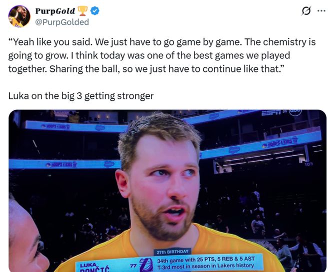 東契奇賽後也開心的表示:“我認為今天是我們(湖人三巨頭)一起打得最好的比賽之一,我們在分享球方面做得很好,相信我們會越打越好。”