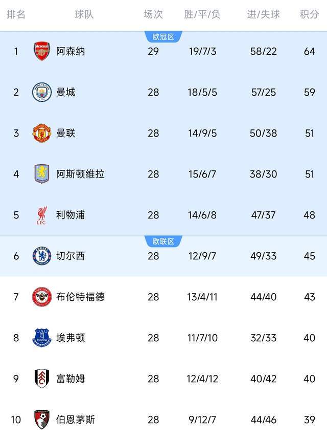 英超一共38輪,還剩最後10輪!沖刺階段的英超聯賽勢必將展開更激烈的競爭。而尤其是在歐冠區域。目前,阿森納多賽一場64分穩居第一,曼城59分緊隨其後。曼聯沖到第3,和阿斯頓維拉同積51分。利物浦、切爾西位列第5、第6,對於前四的爭奪來看,紅軍和藍軍有些掉隊的感覺。